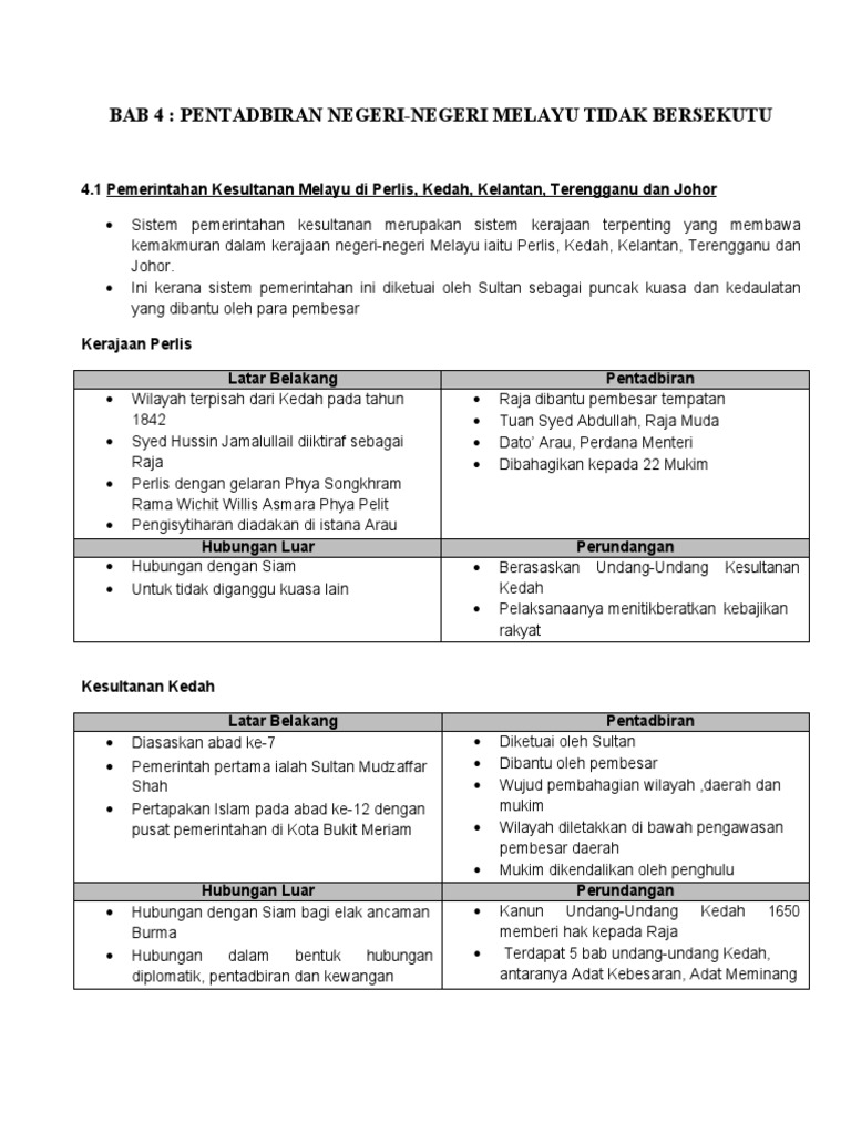 Bab 4 pentadbiran negeri negeri melayu tidak bersekutu. Negeri negeri melayu bersekutu fms adalah sebuah persekutuan empat negeri yang dilindungi di semenanjung tanah melayu selangor perak negeri sembilan dan pahang yang ditubuhkan oleh kerajaan inggeris pada tahun 1896 yang berlangsung hingga tahun 1946 ketika mereka bersama sama dengan dua negara bekas negeri negeri selat melaka dan pulau pinang dan negeri negeri melayu tidak. Melalui sistem pemerintahan nnmb ini. Start studying sejarah tingkatan 3.