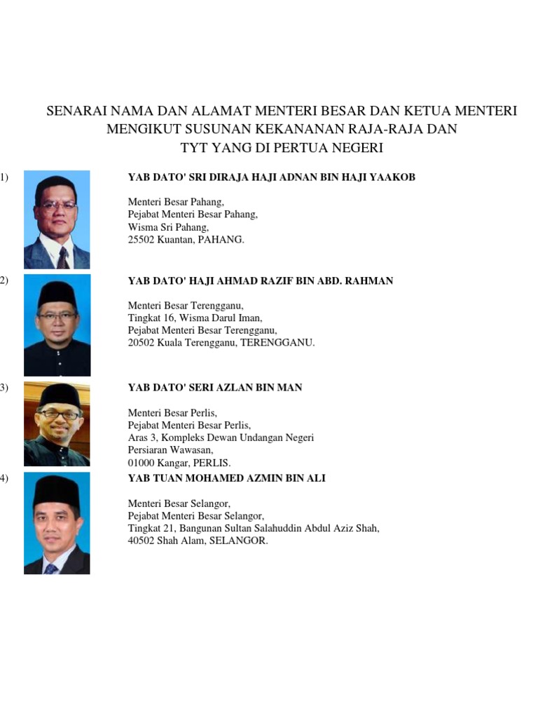The 14th and current menteri besar of terengganu is ahmad samsuri mokhtar who took office on 10 may 2018. Kami ni namanya duk kuantan pahang tapi suami dan anak anak kakya bekerja dan bersekolah di terengganu. 6 yab tuan chow kon yeow ketua menteri. 5 yab dato seri haji aminuddin bin harun menteri besar negeri sembilan pejabat menteri besar negeri sembilan tingkat 5b wisma negeri 70502 seremban negeri sembilan.