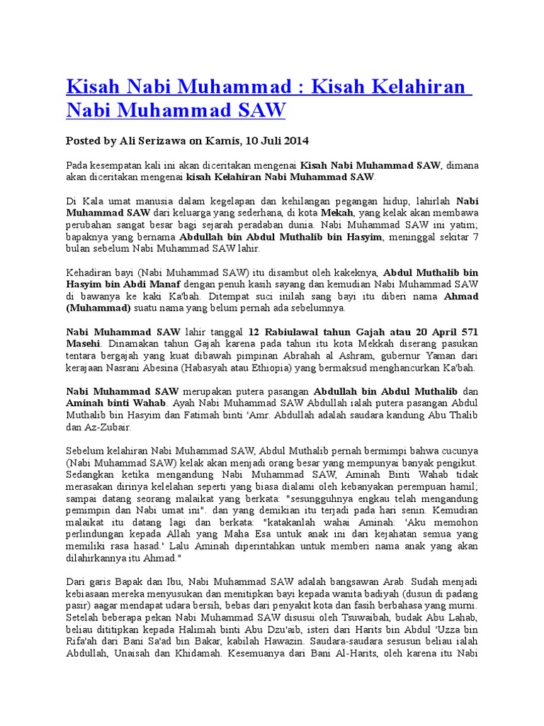 Abdullah bin abdul muthalib 545 570 adalah ayah dari nabi muhammad saw. Muhammad bin abdullah dikenal. Disebut mʊħɑmmæd 570 m 8 jun 632 m merupakan nabi dan rasul yang terakhir bagi umat islam. Nabi muhammad saw dilahirkan di mekkah pada tahun 570 m yaitu pada tahun yang sama ketika raja abrahah dari yaman melakukan penyerbuan ke mekkah dengan maksud untuk menghancurkan kakbah tahun tersebut juga dinamakan sebagai tahun gajah karena pasukan penyerang raja abrahah menggunakan gajah sebagai tunggangannya.