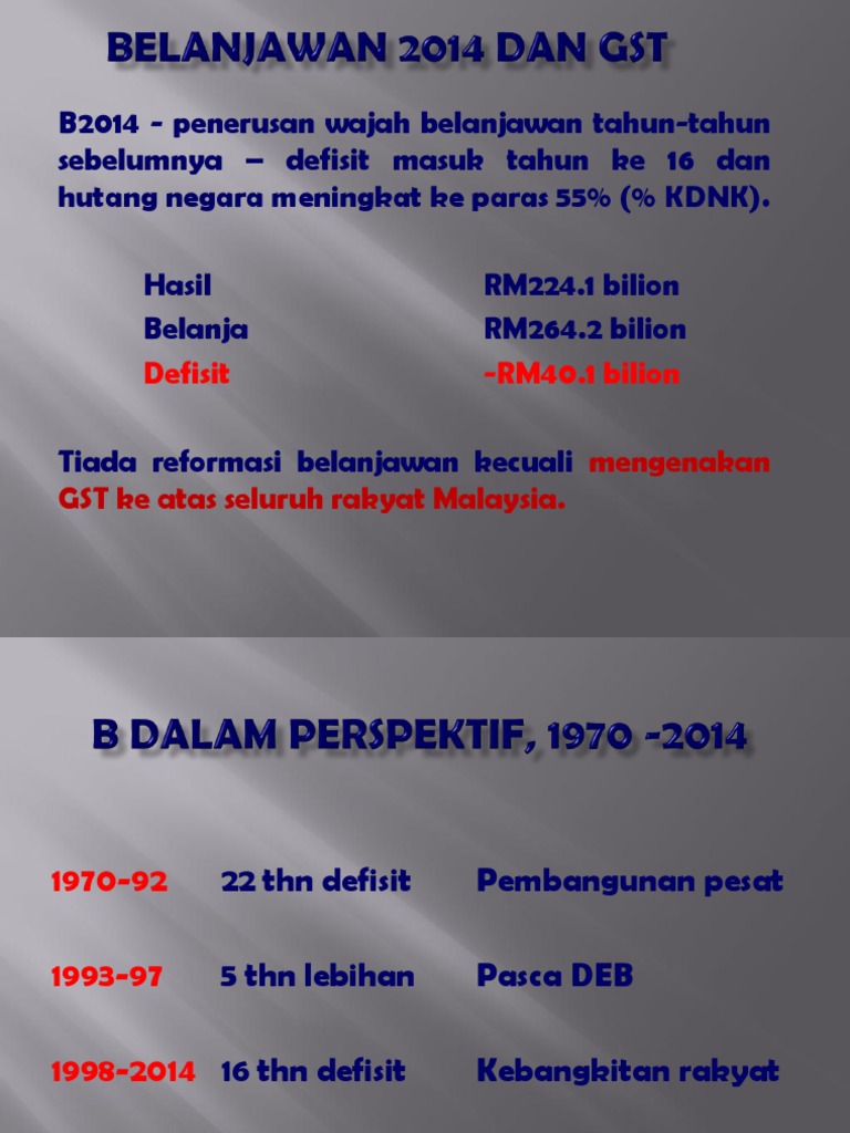 Dan pada tahun 92 telah disebut dlm parlimen namun ditangguhkan juga. Sebagai menghormati mandat yang diberikan oleh rakyat pada pilihanraya umum tahun lalu kerajaan tidak berhasrat melaksanakan semula gst. Sehingga tahun 2004 abdullah badawi kata nak laksana namun ditangguhkan juga. Kenapa gst baru sekarang kenapa tidak 10 tahun lalu jawapan.