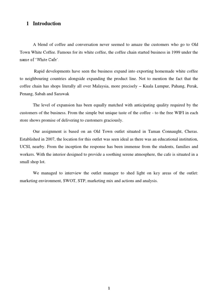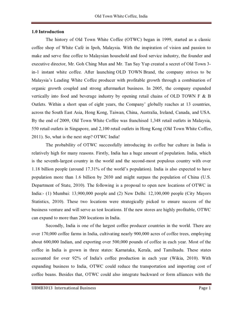 1 0 introduction the history of old town white coffee otwc began in 1999 started as a classic coffee shop of white caf in ipoh malaysia.