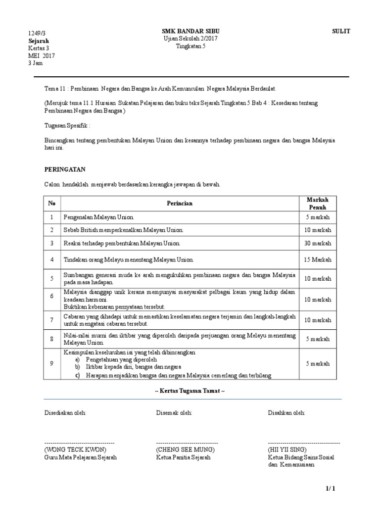 Pembinaan negara dan bangsa malaysia kertas 3 malayan union. 4 1 1 sebab sebab pengenalan malayan union 4 1 2 ciri ciri perjanjian malayan union 1946 4 1 3 reaksi terhadap malayan union 4 1 4 tindakan orang melayu menentang malayan union. Cadangan peraturan pemarkahan kertas 3 pembinaan negara dan bangsa malaysia 1. Skema jawapan pembinaan negara dan bangsa malaysia kertas via www permohonan my. Semoga perkongsian bahan bahan rujukan panduan bahan pembelajaran dan pengajaran contoh contoh karangan sumber rujukan spm sijil pelajaran malaysia tingkatan 4 tingkatan 5 dalam post di blog bumi gemilang berguna dan dapat membantu para pelajar dan.