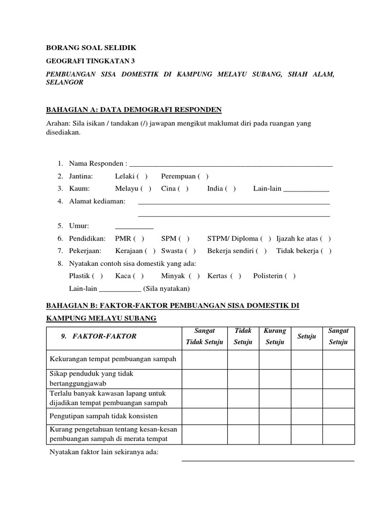 Dskp kssm geografi tingkatan 1 dan panduan kerja lapangan 2017 source. Selain itu sisa domestik juga wujud daripada pembuangan bahan buangan kilang seperti minyak sisa toksik dan sisa kilang dengan sebahagian nya tidak memikirkan kesannya apabila dibuang di merata tempat katanya. Contoh borang soal kaji selidik tugasan geografi pt3 2014 contoh rasmi borang soal atau kaji selidik bagi tugasan geografi pt3 2014. Pencemaran alam sekitar di kampung kuala ibai kuala terengganu borang soal selidik responden 1.