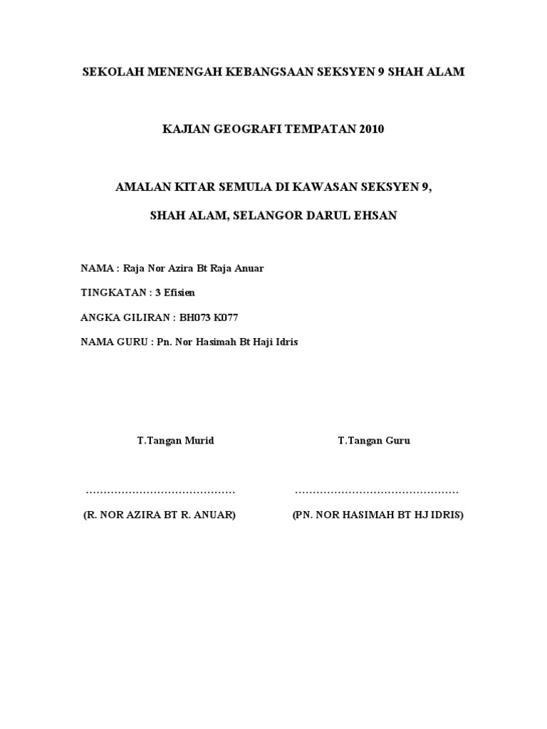 Panduan buat pelajar tingkatan 3 yang ingin menyiapkan tugas kerja kursus geografi pt3 dimana tajuk tugasan yang diberikan berjudul kajian guna tanah di kawasan tempat tinggal atau sekolah anda. Berikut adalah contoh kerja kursus geografi pt3 sistem pengangkutan yang dapat dijadikan panduan dan rujukan kepada pelajar semua menyiapkan kerja kursus folio geografi pt3 2016. Panduan tugasan bagi kajian taburan guna tanah dengan peta lakar. Elemen kitar semula 1 reduce mengurangkan sisa pepejal untuk meminimumkan penggunaan sumber semula jadi 2 reuse tindakan penggunaan semula barangan secara berulang kali untuk mengurangkan penghasilan sisa.