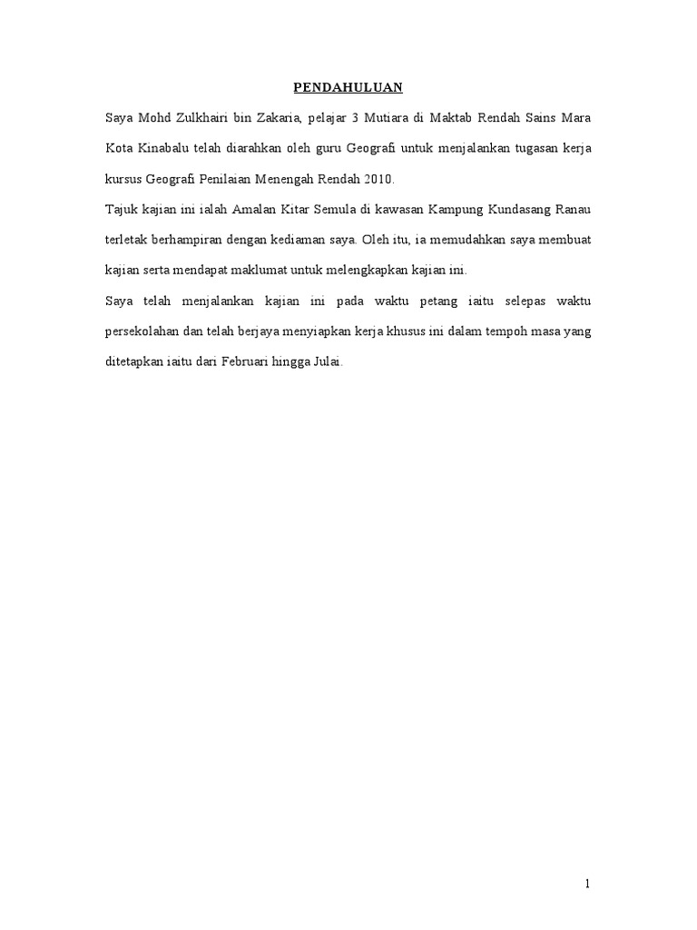 Pendahuluan kerja lapangan geografi tingkatan 3 amalan kitar semula. Oleh itu saya telah diarahkan oleh guru untuk membuat kajian ini di kawasan yang mempunyai amalan kitar semula. Pelajar tingkatan 3 perlu menyiapkan kerja kursus yang merupakan jenis pentaksiran pelbagai instrumen yang terdapat dalam peperiksaan pt3. Saya memilih kawasan nama kawasan kajian sebagai kawasan kajian kerana saya juga merupakan salah seorang penduduk tetap di kawasan ini. Laporan kerja lapangan geografi tingkatan 1 merupakan sebahagian daripada keperluan pentaksiran tingkatan 1.