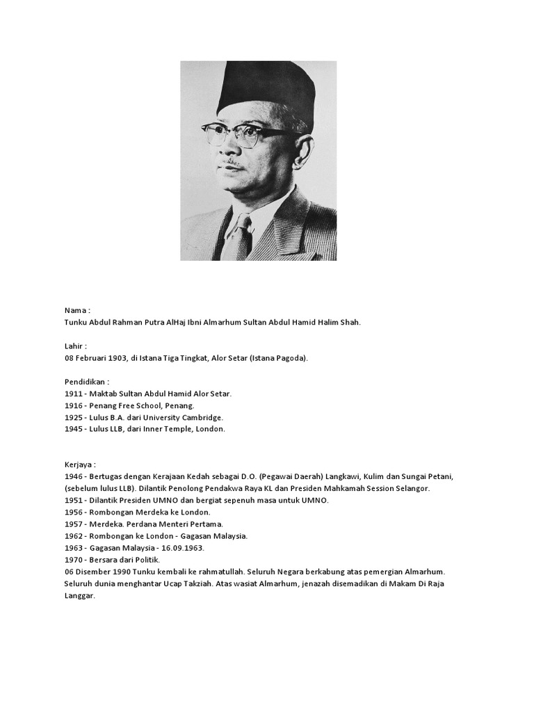 Pendidikan tunku abdul rahman putra al haj. 1916 penang free school penang. Tunku abdul rahman putra al haj ibni almarhum sultan abdul hamid halim shah jawi. Biodata ringkas tunku abdul rahman putra al haj menurut catatan sejarah tunku abdul rahman putra al haj dilahirkan pada 8 februari 1903 di alor star kedah. Biodata perdana menteri malaysia.