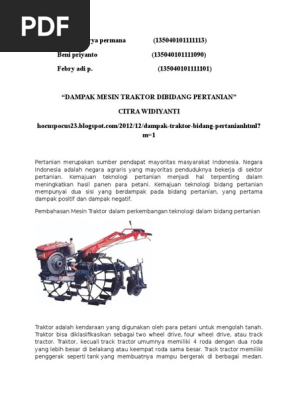 Penemuan teknologi penggunaan traktor dalam pertanian dampak positif dan dampak negatif. Dampak positif dan negatif teknologi dalam bidang pertanian dan perkebunan teknologi dalam bidang pertanian membantu banyak petani dalam mengolah sawah dan bercocok tanam sebagai contoh adanya traktor pembajak sawah yang menggantikan peran manusia atau hewan sebagai pembajak sawah. Dampak positif pengolahan lahan yang luas membuat para petani memerlukan waktu yang lama tanpa adanya teknologi. Kemajuan teknologi bidang pertanian mempunyai dua sisi yang berdampak pada bidang pertania yang pertama dampak positif dan dampak negatif. Dampak itu juga mulai dari hal yang kecil sampai hal yang besar dan akan dirasakan baik dari kalangan anak anak remaja dewasa.