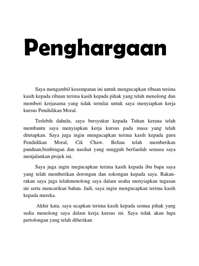 Penghargaan kerja kursus moral. Contoh penghargaan kerja kursus. Mohamad kerana meletakkan kepercayaan beliau kepada saya untuk menyiapkan kerja kursus ini dalam tempoh yang ditetapkan. Mengucapkan jutaan terima kasih kepada pensyarah dan tutor bagi subjek moral etika kami cik lydia chong yuk fong kerana memberi peluang kepada kami untuk melaksanakan projek yang amat istimewa ini. Am contoh abstrak kerja kursus p am sekali lagi takde rezeki setem baru deutschland setem dari kak farrah final exam sem 2.