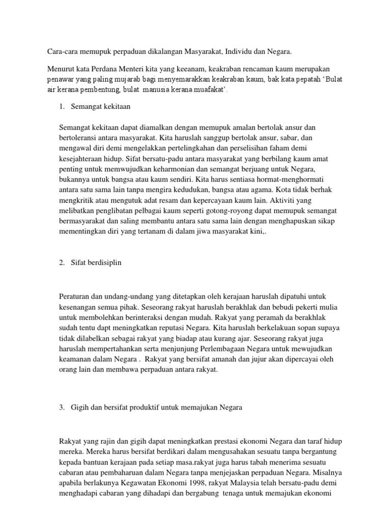 Peranan kerajaan dalam memupuk perpaduan. Pelbagai dasar telah dijalankan untuk mencapai proses perpaduan ini. Soalan jawapan strategi keseimbangan ekonomi strategi sistem pendidikan strategi kepercayaan agama strategi penggunaan bahasa kebangsaan strategi kebudayaan strategi integrasi wilayah strategi kesukanan strategi keselamatan memperkenalkan plkn strategi pembangunan kawasan. Ram berikut ialah contoh karangan tentang tajuk berkenaan. Menekankan semangat muhibah serta bertolak ansur antara peserta tidak mengira kaum bangsa agama.