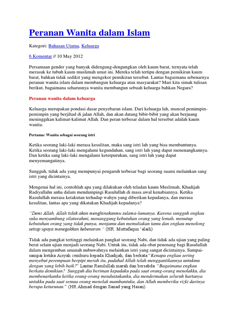 Beberapa peran wanita tersebut dalam keluarga intinya adalah. Semangat mereka bisa jadi pelajaran berharga untuk para wanita agar senantiasa bersungguh sungguh dalam mencapai tujuan mereka. Sejarah kegemilangan umat islam telah memperlihatkan betapa golongan wanita mempunyai kedudukan yang begitu mulia lagi penting dalam masyarakat. Dari keluarga lah muncul pemimpin pemimpin yang berjihad di jalan allah dan akan datang bibit bibit yang akan berjuang meninggikan kalimat kalimat allah.