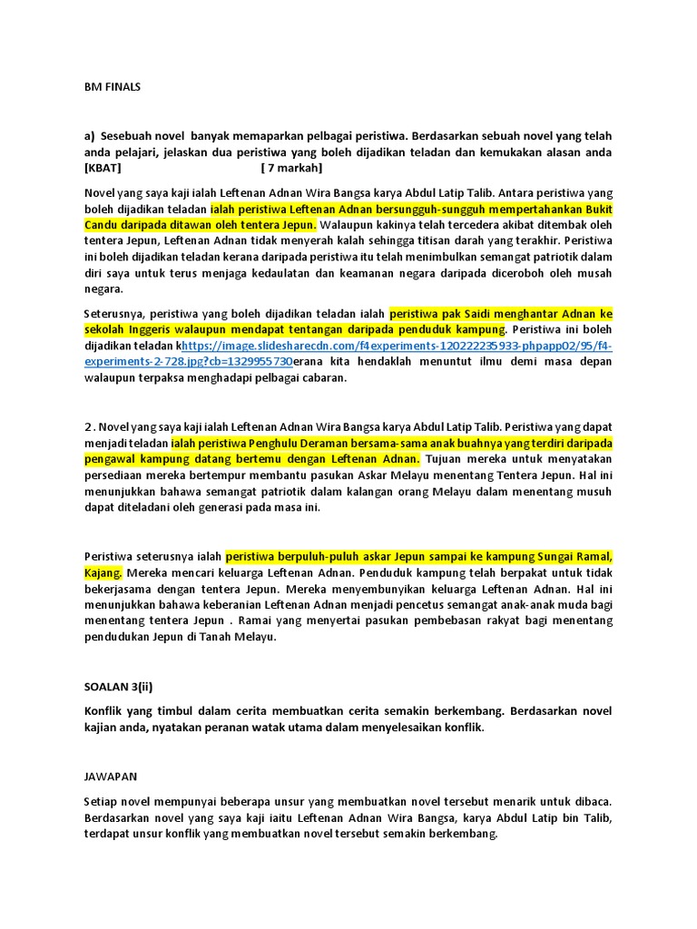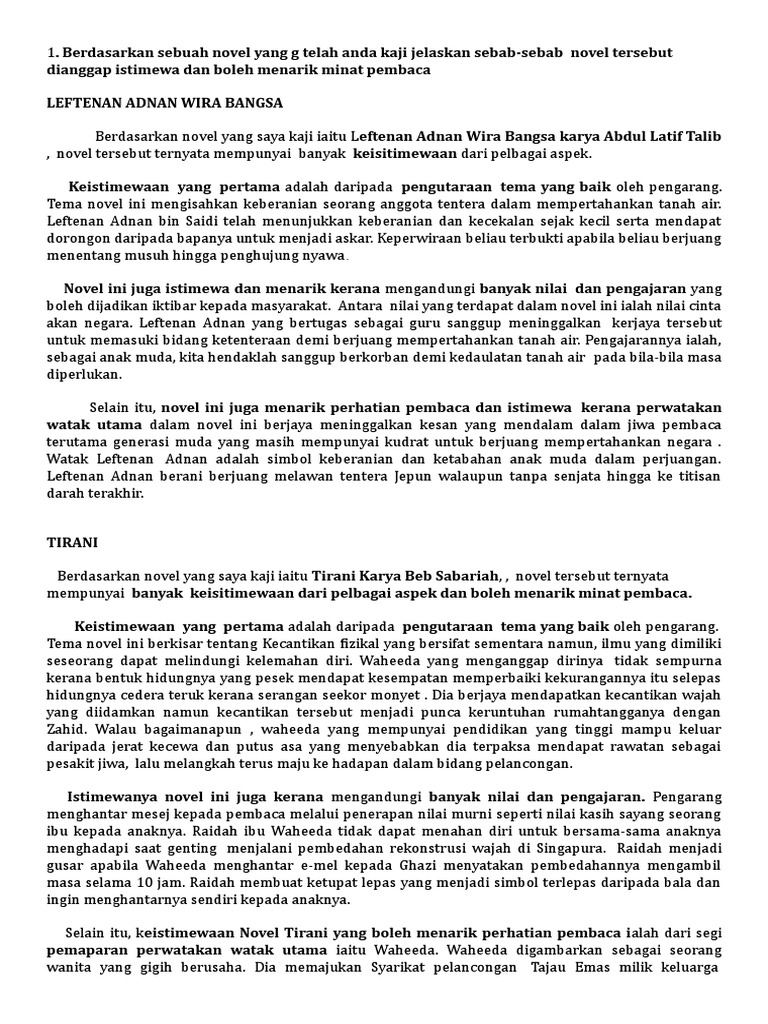 Contoh jawapan bagi novel leftenan adnan wira bangsa. Berdasarkan sebuah novel yang telah anda pelajari jelaskan dua peristiwa yang boleh dijadikan teladan dan kemukakan alasan and contoh jawapan bagi novel leftenan adnan wira bangsa. Sesebuah novel banyak memaparkan pelbagai peristiwa. Novel yang saya pelajari ialah leftenan adnan wira bangsa.