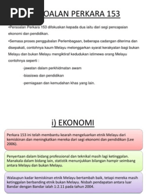 2 walau apa pun apa apa jua dalam perlembagaan ini tetapi tertakluk kepada peruntukan perkara 40 dan peruntukan perkara ini yang di pertuan agong hendaklah menjalankan fungsinya di bawah perlembagaan ini dan undang undang persekutuan mengikut apa apa cara yang perlu untuk meindungi kedudukan istimewa orang melayu dan anak negeri mana mana antara negeri sabah dan sarawak dan untuk. Antaranya ialah berkaitan dengan perlembagaan persekutuan perkara 153 perlembagaan persekutuan malaysia iaitu berkaitan dengan hak keistimewaan orang melayu dan bumiputera taraf kewarganegaraan dan parti perikatan. Download file pdf read file. Melainkan jika dan sehingga ditetapkan sahih di bawah perkara 160b perlembagaan persekutuan teks ini bukan perundangan.