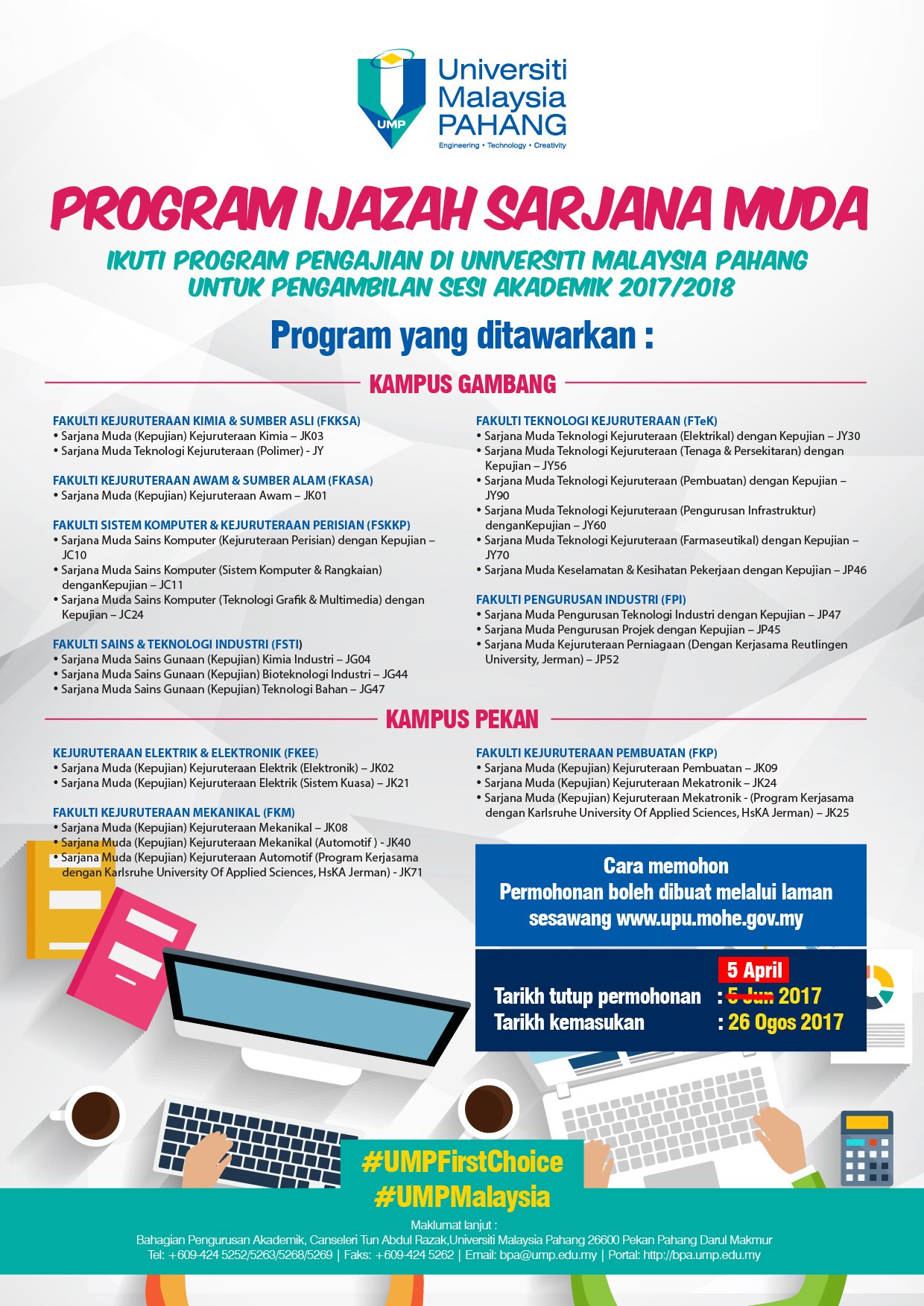 Untuk makluman permohonan kemasukan ke ump bagi program diploma ijazah sarjana muda dan sarjana muda masters untuk ambian september 2020 boleh dibuat terus ke laman portal ump. Syarat kemasukan ke program ijazah sarjana muda dan diploma. Lulus peperiksaan sijil pelajaran malaysia atau setaraf dengan mendapat sekurang kurangnya lima 5 kepujian gred c termasuk bahasa melayu dan. Bagi mereka yang ingin melanjutkan pengajian ke peringkat ijazah sarjana muda untuk rujukan berikut adalah senarai program ijazah sarjana muda yang ditawarkan di universiti malaysia pahang.