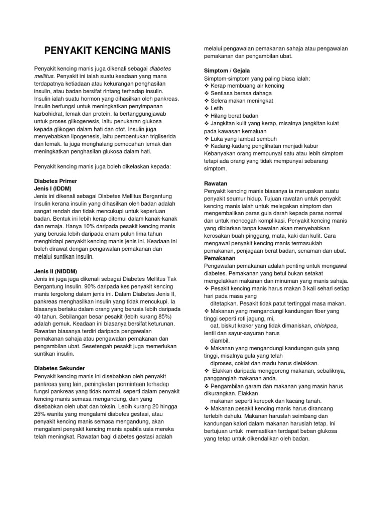 Kira kira 90 daripada penghidap diabetes mempunyai diabetes jenis 2. Tanda tanda atau simptom kencing manis diabetes kadang kadang terlalu sukar untuk dikesan sehinggakan pesakit tidak. Gatal yang teruk dalam kencing manis. Statistik terbaru menunjukkan 17 peratus daripada penduduk di malaysia menghidap diabetes mellitus atau kencing manis.