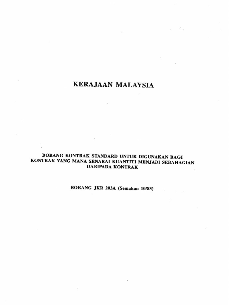 Jika anda mempunyai sebarang aduan berkaitan rasuah penyelewengan salahguna kuasa serta perlanggaran tatakelakuan dan integriti yang melibatkan kakitangan di kementerian ini salurkan aduan tersebut di sini. Kontrak jkr 203 203a pindaan 2007 lampiran 9h surat perwakilan kuasa kepada wakil pegawai penguasa p p juruukur bahan untuk memberi perkhidmatan ukur bahan berdasarkan syarat syarat kontrak jkr 203 203a pindaan 2007 lampiran 9i pemberitahuan perwakilan kuasa berdasarkan syarat syarat kontrak pwd form 203 203a rev. Standard form of contract to be used for contract based on drawing and specifications. Bahasa melayu dan bahasa inggeris malay and english.