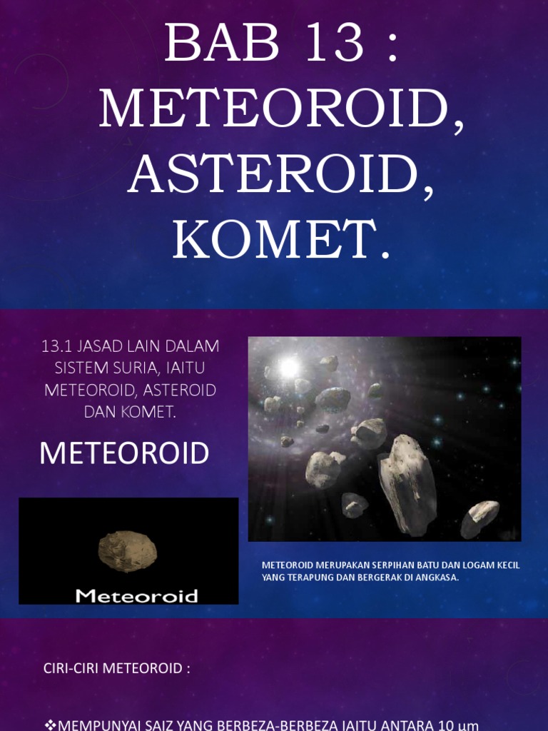 Bab 13 meteoroid asteroid komet. Selamat datang kuiz uji minda. Ini ialah video pengenalan bagi modul yang bertajuk meteoroid asteroid dan komet dalam subjek sains tingkatan 2. Sains tingkatan 2 bab 13 meteoroid asteroid komet.
