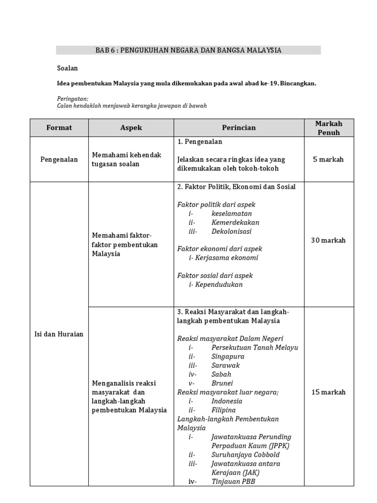 Sejarah kertas 3 bab 6 tingkatan 5 pembentukan malaysia. Soalan kertas 3 tingkatan 5 bab 6. Sejarah tingkatan 5 t5b6 nota bab 6 pengukuhan negara dan bangsa malaysia noraini abdul rahman smkusj13 2 membangun. Semoga perkongsian bahan bahan rujukan panduan bahan pembelajaran dan pengajaran contoh contoh karangan sumber rujukan spm sijil pelajaran malaysia tingkatan 4 tingkatan 5 dalam post di blog bumi gemilang berguna dan dapat membantu para pelajar dan pengguna. Tema tajuk 11 1 pengukuhan negara dan bangsa yang merdeka soalan huraikan sejarah pembentukan malaysia dan menghubungkaitkannya dengan kegemilangan negara kita pada hari ini.
