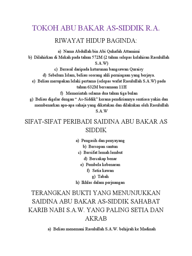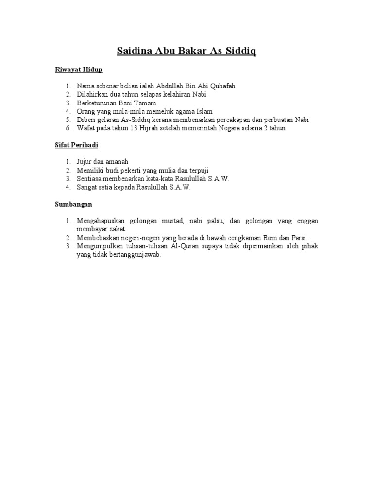 Sifat peribadi khalifah abu bakar as siddiq. Beliau bukan sahaja dapat menyelamatkan umat islam daripada perpecahan umat dan negara islam daripada golongan yang tidak bertanggungjawab malah saidina abu bakar dikatakan telah menyediakan ruang yang secukupnya untuk bakal penggantinya iaitu saidina umar al khattab. Khulafaur rasyidin khalifah abu bakar siddiq kepribadian abu bakar siddiq 1 sebelum masuk islam abu bakar telah memiliki kepribadian yang bersih. Pemilihan ini tentulah tepat sekali kerana pada pandangan kaum muslimin memang beliaulah yang paling layak sekali memegang kedudukan itu memandangkan kelebihan kelebihannya dari para sahabat yang lain. أبو بكر الصديق abū bakr al siddīq ialah khalifah pertama orang muslim dari tahun 632 634 beliau pada awalnya digelar abdul kaabah hamba kaabah tetapi selepas pengislamannya beliau menukar namanya kepada abdullah namun beliau selalu digelar abu bakar daripada perkataan arab bakar yang bermaksud unta muda kerana beliau amat gemar membiak.