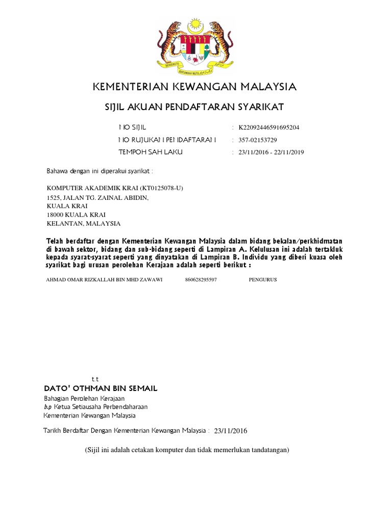 Sijil akuan pendaftaran syarikat in english. Surat perlantikan pekerja dan sijil tertinggi mereka. Sebarang percanggahan maklumat di dalam sijil virtual pt ps sa bpk admin akan memaklumkan kepada kpspk ps cdcsb untuk diambil tindakan sewajarnya. Borang 9 24 49 yang terbaru dan semua syarikat bersekutu bagi syarikat yang ditubuhkan sebelum tahun 2016. Fi pendaftaran perniagaan dan syarikat.