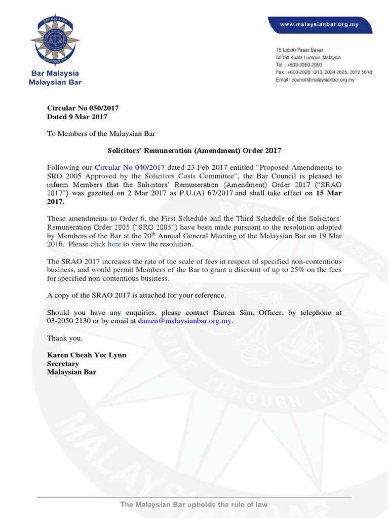 The srao makes several important changes to the solicitors remuneration order 2005 which establishes the amount of fees to be paid to a lawyer for handling a property transaction this includes sal. Solicitors remuneration amendment order 2017 srao on march 11 2017 march 11 2017 by kimberly in law student uncategorized probably expected that there will be an increase in the legal fees for people buying property. These amendments to order 6 the first schedule and the third schedule of the solicitors remuneration order 2005 sro 2005 have been made pursuant to the resolution adopted by members of the bar at the 70th annual general meeting of the malaysian bar on 19 mar 2016. The srao increases the rate of the scale of fees to the first schedule fees for sales and transfers and the third schedule fees for charges debentures and other security or financing documents of solicitors remuneration order 2005 sro which sets out.