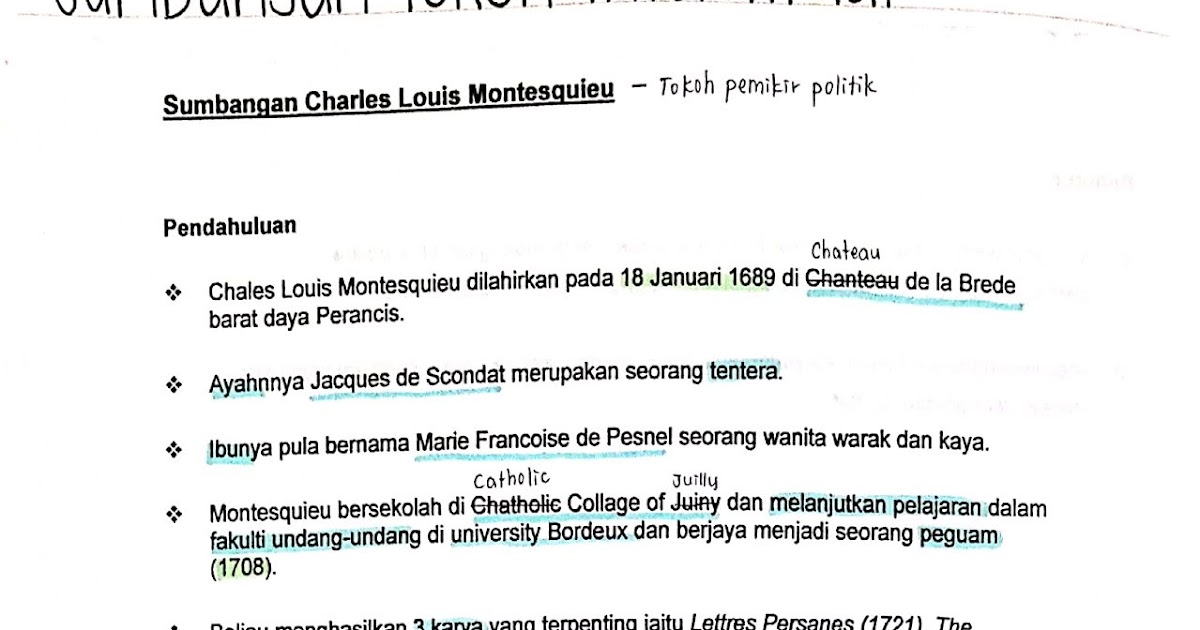 Lulusan undang undang dari universiti bordeaux dan berjaya jadi peguam pada 1708. Bincangkan karya dan sumbangan charles louis montesquieu dalam aspek intelektual. Sumbangan charles louis montesquieu charles louis montesquieu dilahirkan di chateau de la brede barat daya perancis pada 18 januari 1689. Beliau merupakan tokoh pemikir politik perancis dan banyak memberi sumbangan dan idea semasa zaman pencerahan.