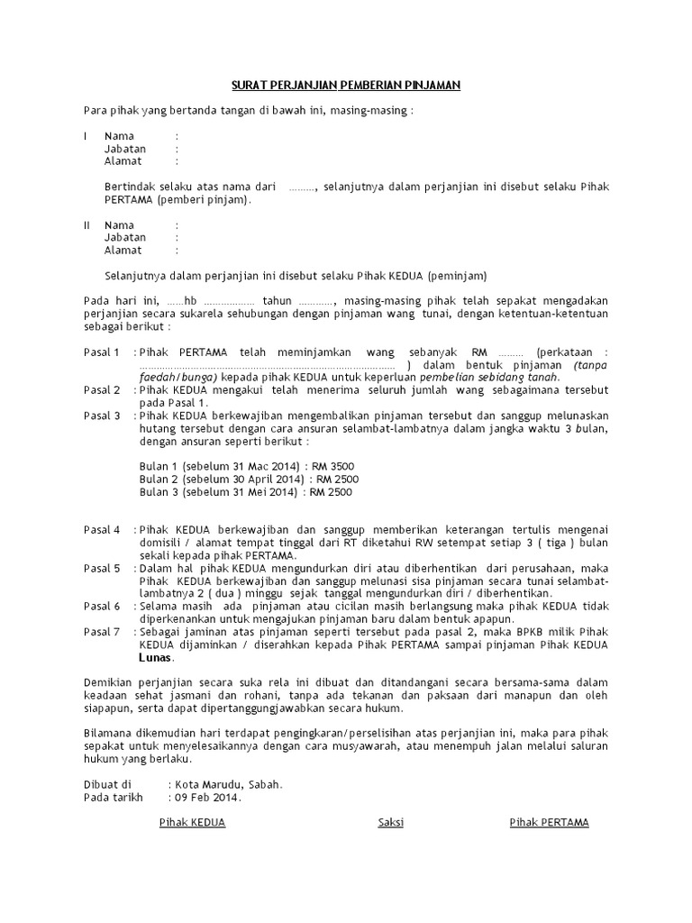 Namun agar lebih terstruktur dan memiliki bukti fisik maka kedua belah pihak biasanya akan menggunakan surat perjanjian. Surat perjanjian merupakan perjanjian formal diantara dua orang individu atau dua pihak badan organisasi agensi yang berlainan. Nanti nak tuntut balik tak boleh maka meleburlah hutang rm5 000 atau rm10 000 atau rm15 000. Apabila kata putus dicapai dan.