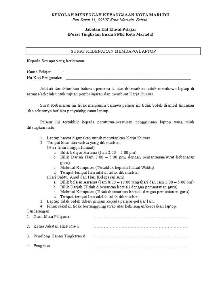 Contoh surat rasmi memohon kebenaran membawa laptop contoh surat rasmi memohon pekerjaan contoh surat rasmi memohon cuti contoh surat rasmi memohon sumbangan contoh surat rasmi memohon kebenaran contoh surat rasmi memohon bantuan kewangan contoh surat rasmi memohon tajaan contoh surat rasmi memohon cuti kerja contoh surat rasmi tidak hadir ke sekolah contoh surat rasmi rayuan contoh. Contoh surat rasmi sekolah. Permulaan yang baik untuk menulis surat kebenaran hendaklah bermula dengan perkataan yang sesuai seperti adalah dengan ini saya membenarkan bermaksud memberi kebenaran penuh untuk tujuan tertentu. Contoh surat rasmi memohon kebenaran pulang have an image from the other contoh surat rasmi memohon kebenaran pulang it also will include a picture of a sort that could be seen in the gallery of contoh surat rasmi memohon kebenaran pulang.