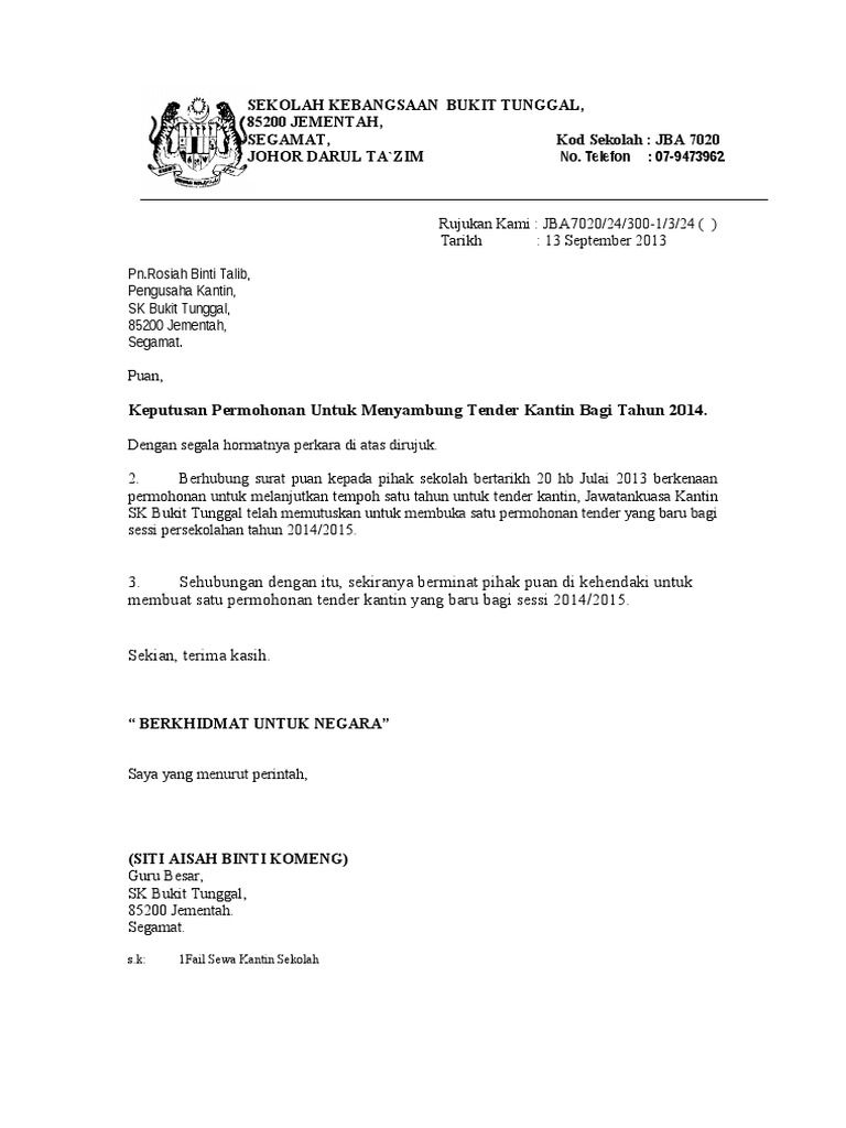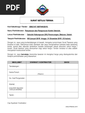 Surat setuju terima tender kerja no. Borang serta dokumen dokumen lain yang berkaitan hendaklah sampai ke pejabat sekolah pada atau sebelum 31 september 2011 jam 12 tengah hari. Penyewaan dan pengurusan kantin sekolah. Surat setuju terima 6 mengesahkan penerimaan sesuatu tawaran berasaskan kepada syarat yang telah ditetapkan dalam dokumen tender syarat dipersetujui dalam surat niat atau syarat syarat lain yang dipersetujui.