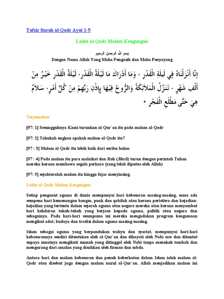 Tafsir surah al qadr ayat 1 5. Ada kaitan antara surah surah dalam ayat al qur an ini. Sebagai umat yang cerdas kita harus memanfaatkan momen ini untuk lebih giat beribadah dan melakukan perbuatan kebajikan lainya. Tugas makalah ilmu tafsir tafsir surat al qadr ayat 1 5 dosen pembimbing. Dalam surat al qadr dijelaskan bahwa pada malam lailatul qadar akan ada salam yang turun hingga terbit fajar apa maknanya.