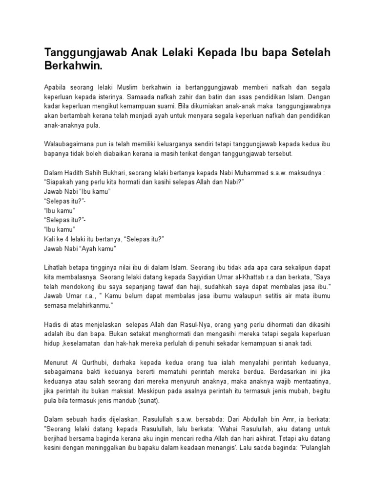 Tanggung jawab anak lelaki terhadap ibu bapa. Anak lelaki pun sebenarnya perlu di ajar untuk melakukan kerja kerja rumah seperti mengemas melipat baju lipat baju dan sebagainya. Tanggung jawab anak lelaki kepada kedua ibu bapa dari sudut pandangan islam yang seterusnya ialah menjaga ibu bapa yang sakit dan uzur akibat usia tua. Sebab itulah dalam islam anak lelaki beroleh 1 2 nisbah faraid berbanding dengan anak perempuan ini menunjukkan betapa islam menghargai tanggungjawab yang dipikul oleh anak lelaki sebagai ketua keluarga. Tidak abai tanggungjawab terhadap ibu bapa.
