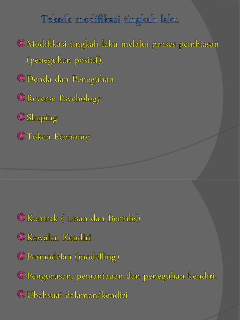 Save save teknik modifikasi tingkah laku for later. Rizki siddiq nugraha modifikasi tingkah laku penggerak utamanya adalah. Kontrak tingkah laku merupakan salah satu kaedah pendidikan kesihatan yang terkandung di dalam teknik modifikasi tingkah laku manusia. Penghapusan extinction time out pembanjiran flooding penjenuhan satiation hukuman.