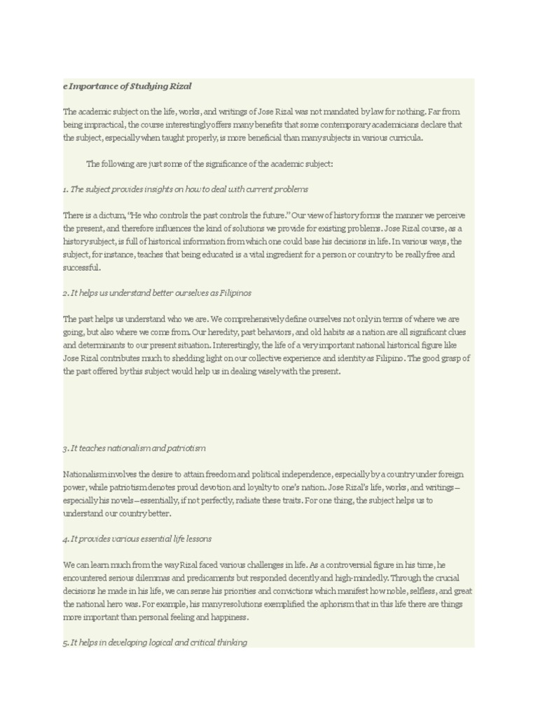 What is the significance of studying the life and works of jose rizal. Jose rizal s love for the country led him to his execution. By studying and understanding the life of rizal people will become aware of the ethics that the country created upon. 2014 07 21 15 58 06 2014 07 21 15 58 06. They question the use of these subjects on the career that they will be pursuing after graduation how their money is wasted on those units and how their time is consumed just to earn good grades for the subjects.